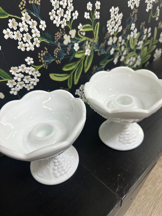 Set of 2, Vintage Ribbed White Milk Glass Candle Sticks