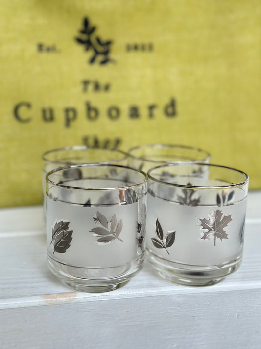 Set of 4, Vintage Libbey Small Silver Foliage/ Leaves Frosted Old Fashion Glasses