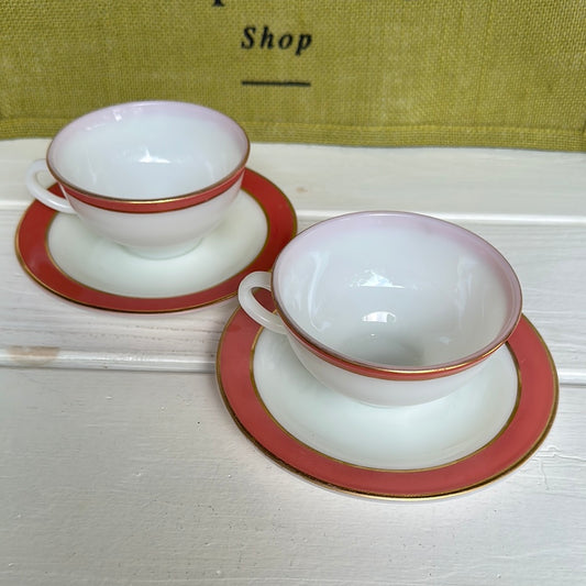 Set of 2, Vintage Pyrex Cup & Saucer Pink Flamingo Band Gold Rim Trim Milk Glass