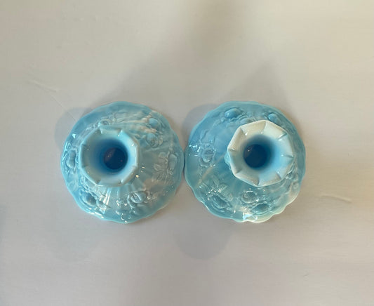Vintage Fenton Handmade Glossy Marble Blue and White Rose Candle Sticks, Pair of 2