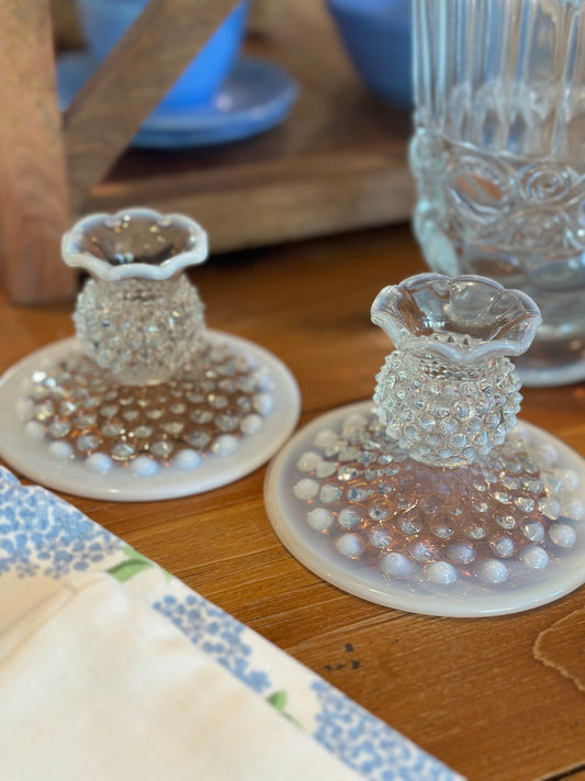 Vintage Opalescent Hobnail Candle Stick Holder, Set of 2