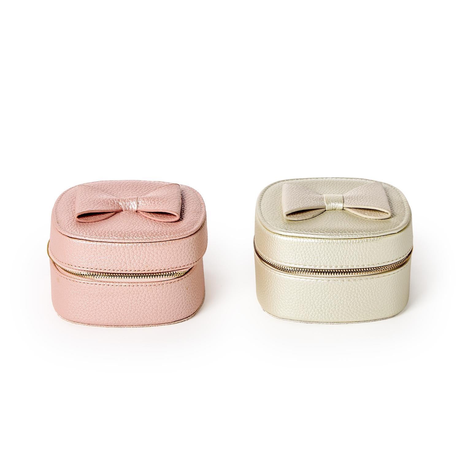 Keep your jewelry organized in style with the Belle Jewelry Storage Box-a chic and compact solution for storing your favorite pieces. Designed with a charming bow detail on top, this elegant case features a secure zip-around closure and thoughtfully designed interior compartments to keep rings, earrings, and necklaces neatly in place. Available in two soft, timeless shades-Pink and Ivory-this jewelry box is perfect for travel or everyday use, adding a touch of sophistication to your storage routine.
