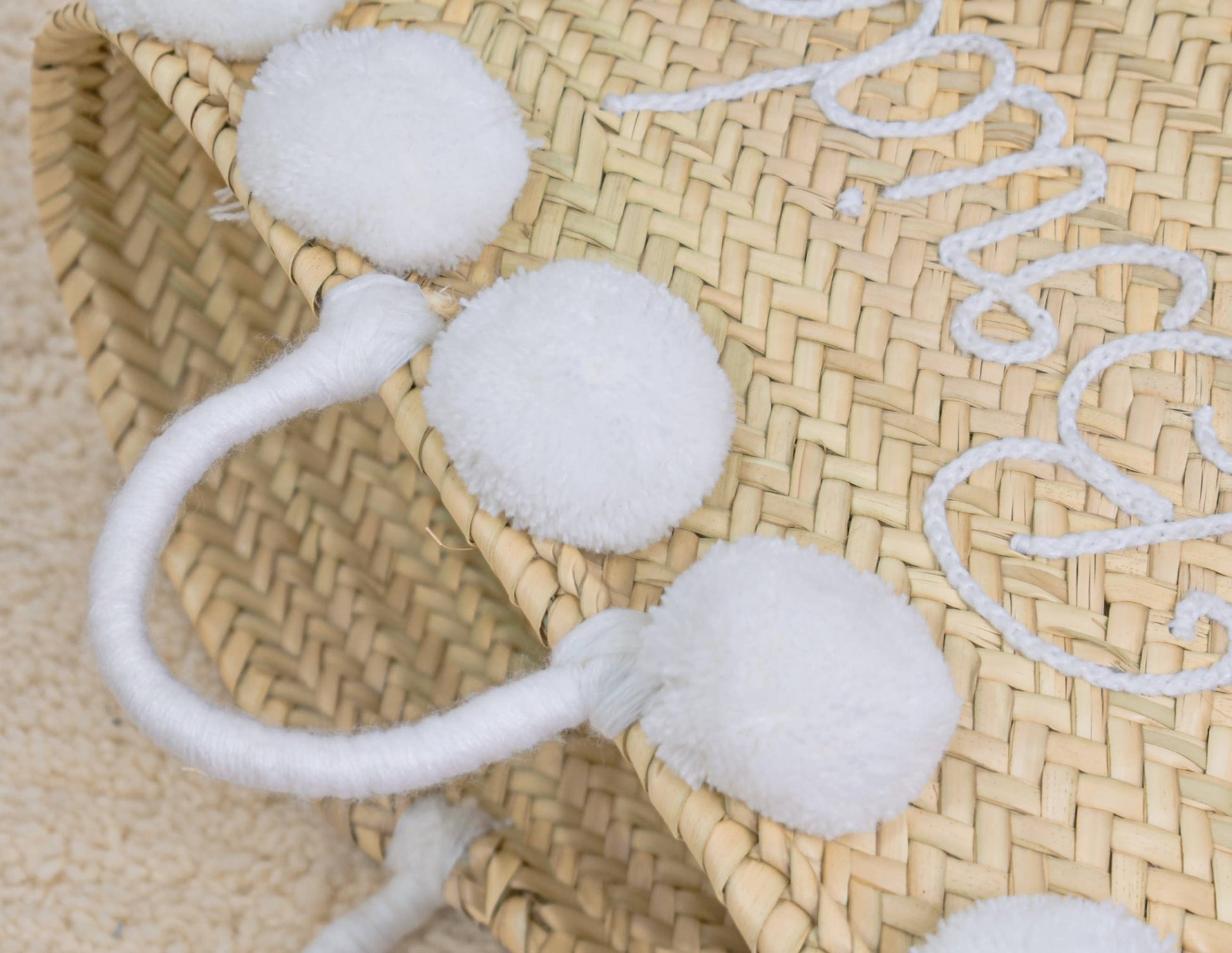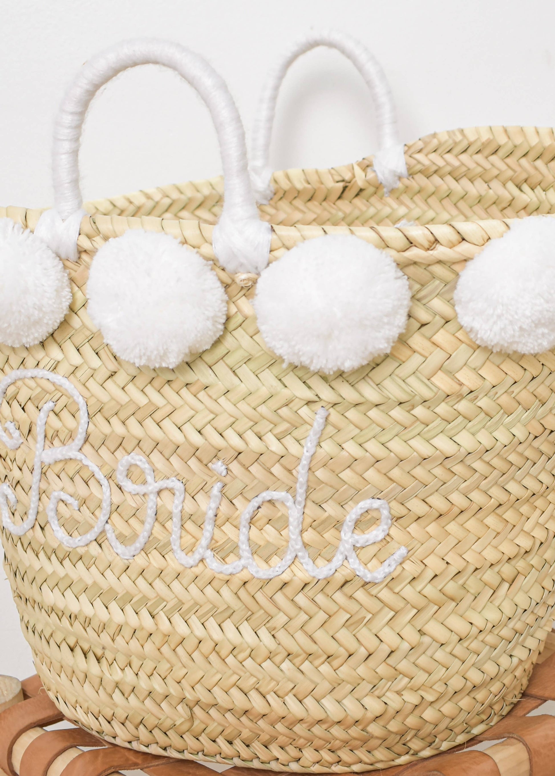 'Bride' Straw Tote with Pom-Poms for Weddings