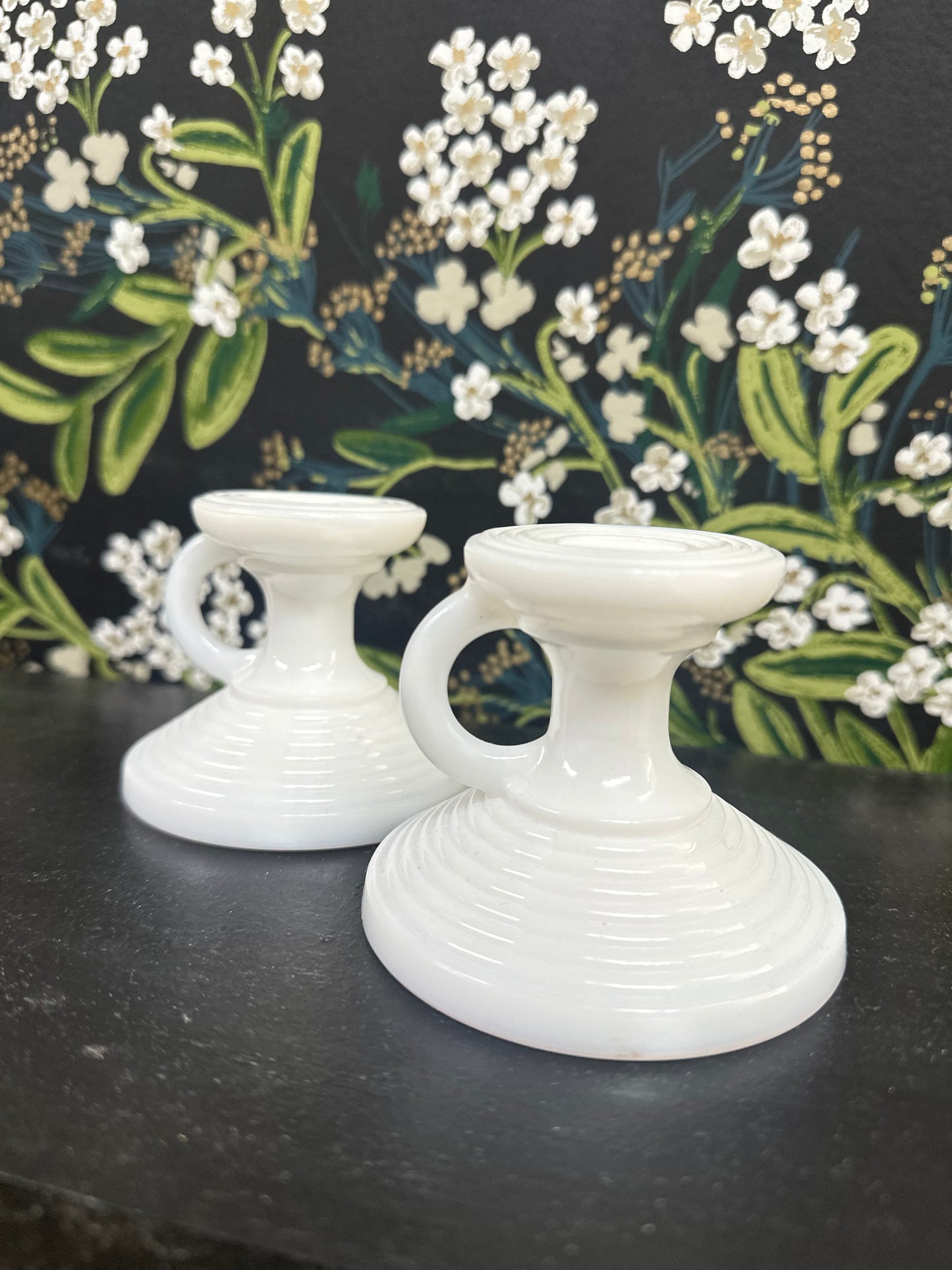 Set of 2, Vintage Ribbed White Milk Glass Candle Sticks