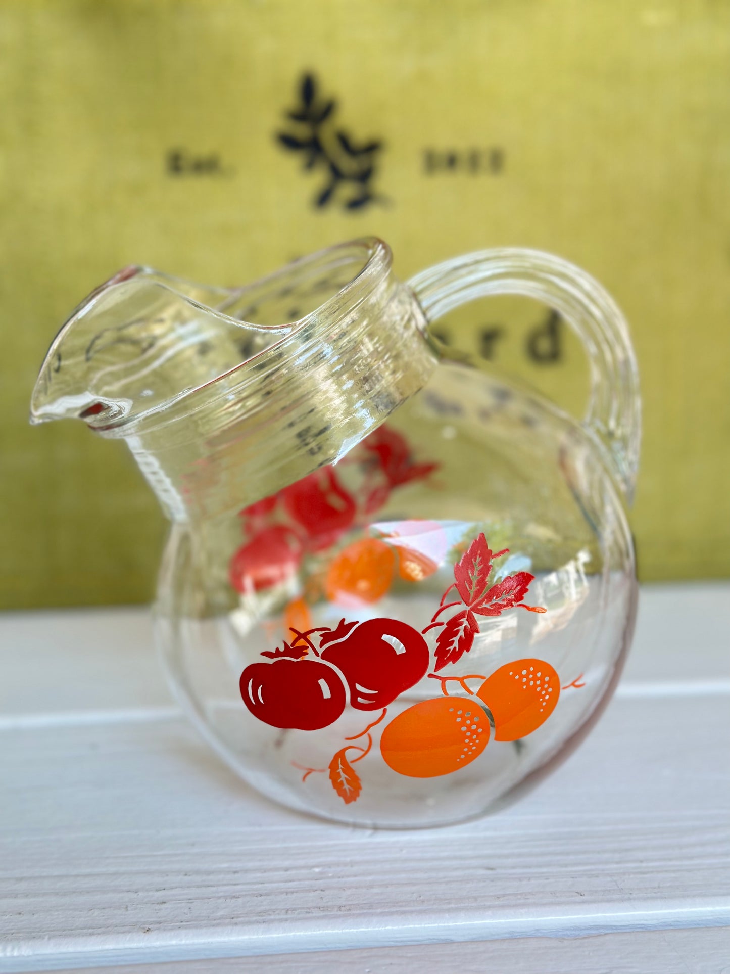 Vintage Clear Glass Titled Juice Pitcher w/ Apples & Orange
