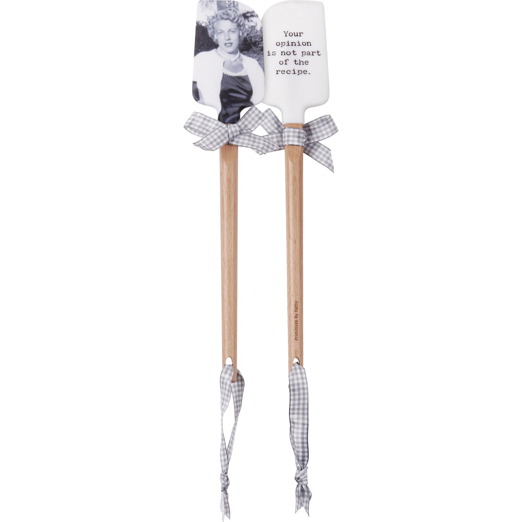 A double-sided silicone spatula from our features a vintage photograph on one side, and "Your Opinion Is Not Part Of The Recipe" sentiment on the other side. Logo is engraved into wooden handle for added interest and includes a decorative gray and white gingham bow and ribbon for hanging. The Part Of The Recipe spatula is hand-wash recommended; not microwave safe.